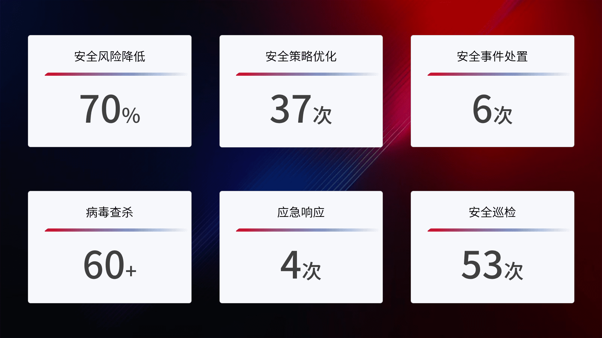 提供全面的安全事件报告体系,,,包括处置报告、、、、周报、、、、季度和年度总结,,,结合持续监控,,,,帮助客户深入了解网络安全状况。。