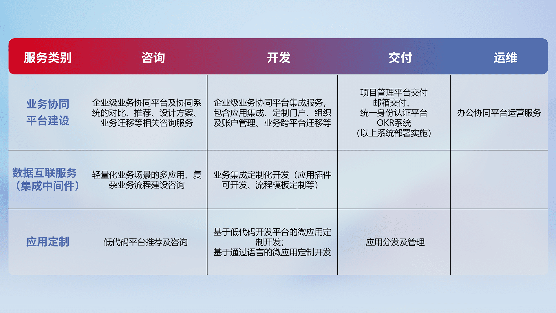 针对钉钉、、、、企微、、、、IDaas等平台级产品提供产品的规划、、、方案、、、、交付、、、定制化开发等服务,,,实现如统一协同办公、、、、智能客户服务、、、混合会议管理、、智能数据查询、、、、等业务场景,,,,实现数字化转型。。。