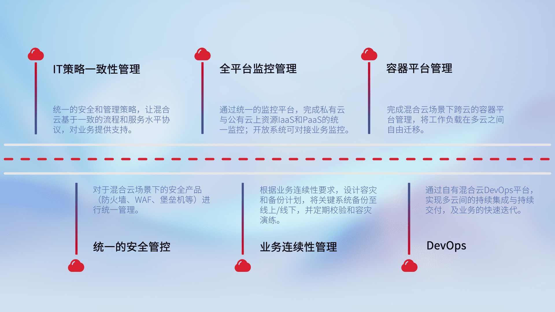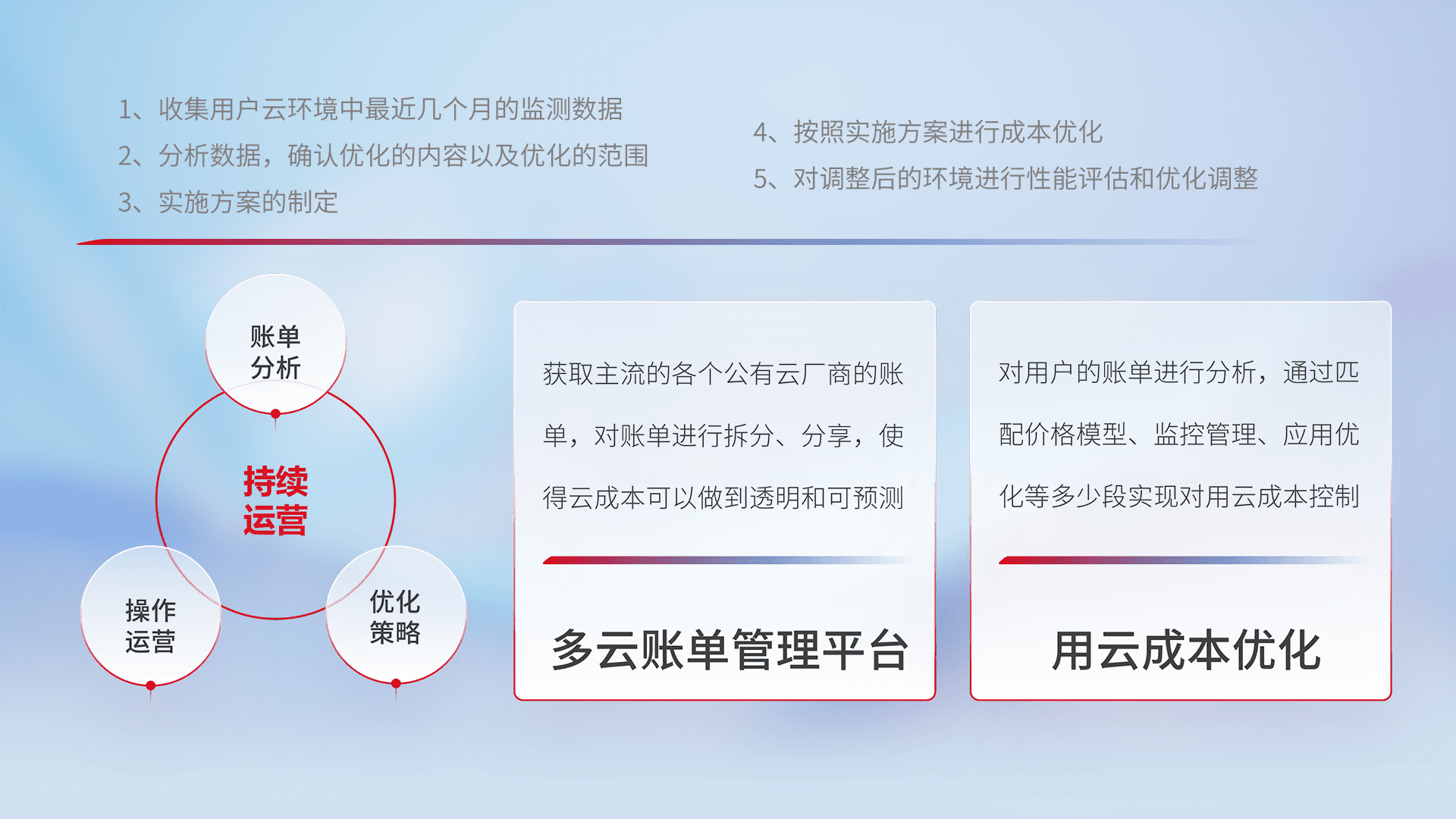 通过多云纳管,,,以统一的资源数据模型把客户的云资源进行抽象和封装,,,,进而实现对多云资源的统一操作,,,,保障云资源管理的可靠性、、稳定性与可用性。。量身定制化运维内容,,,,配置、、、开发运维、、、补丁管理、、备份、、、监控、、、、认证和访问管理、、审计和日常巡检等,,,保障在用云过程中的可靠度,,稳定度以及高可用率。。。。