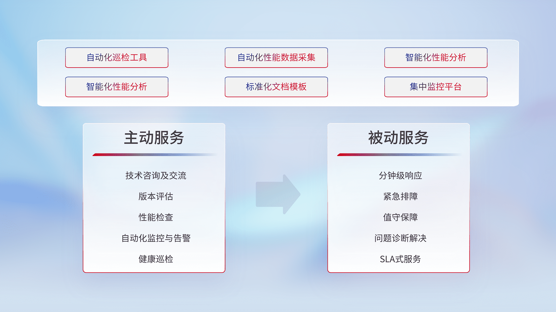 智能化工具和标准化文档,,保障服务质量,,,提供主动服务(包含技术咨询、、、版本评估、、、、性能检查、、、自动化监控与告警、、、、健康巡检)和被动服务包含(分钟级响应、、、、紧急排障、、值守保障、、问题诊断解决、、、SLA服务)。。。。
